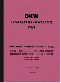 Edition 11/1954, from chassis no.: 46700001 or 46577001 for RT 125/2H. DKW No. 75/2 for engine, chassis, electric machine, electric equipment and special accessories.