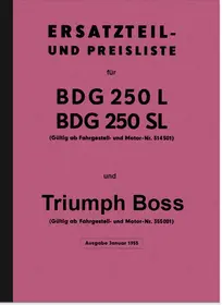 Spare parts list for Triumph BDG 250 L/SL/W and Boss BDG 250 L/SL valid from reg. no.: 314501, BDG 250 W valid from reg. no.: 321307, Boss valid from reg. no.: 355001. edition 1/1955 with addendum 6/1957, in German.