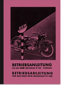 Operating instructions for DKW RT 200 3-speed without rear suspension, RT 250 with sidecar 4-speed transmission with rear suspension and Hella, Bosch or Notek headlights, half and full hub brakes.