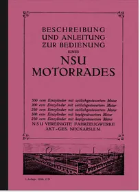 Operating instructions for NSU 1-cylinder models with 250, 300 and 500 cc, with SV and OHV engines. Sport and touring models, (250T, 301T and 501T). Edition February 1929. With many cross-section drawings and lubrication plans for the machines.