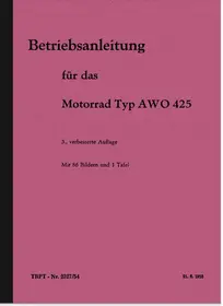 Operating manual with repair instructions for AWO 425, 250 ccm, 1-cylinder 4-stroke, 12 hp touring model. Edition 1955, in german.
