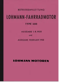 Technical data, maintenance, minor repairs, etc. Including spare parts list for Lohmann Type 500 bicycle auxiliary motor. Edition 1.8.1950 and edition February 1953