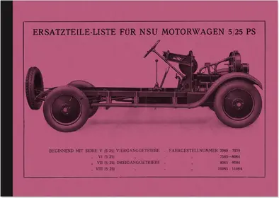 Spare parts list for NSU 5/25 PS motor car series 5 /6 /7 /8, series V 4-speed ref. no.: 7080 - 7579, series VI 4-speed ref. no.: 7585 - 8084, series VII 3-speed ref. no.: 8085 - 9084, series VIII 3-speed ref. no.: 10085 - 11084, for engine, transmission and chassis.