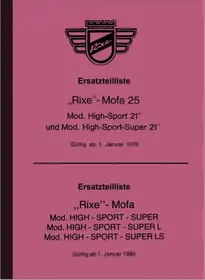 Illustrated spare parts catalog for the Rixe models High-Sport 21", High-Sport-Super 21", Mofa 25 and High-Sport Super - Super L - Super LS. Edition from 1976 and from 1980.