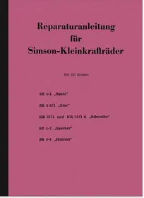 Repair instruction/workshop manual for Simson mopeds 50 ccm. For types: Sparrow, Swallow, Starling, Hawk, Sparrowhawk. Row S 50: S 50N, S 50B /B1, Row SR4 and KR 51: SR4-1SK, KR 51/1, SR4-2/1, SR 4/3 and SR 4/4 with all engine variants. The work on engines and chassis is described. 237 illustrations. Edition December 1975.