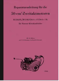 Repair instructions for the Simson 50 cc two-stroke engines: M 53 KHL, M 53 KF, Sö 4-1P and Sö 4-1K Installed in the mopeds SR 1, SR 2, SR 2E, SR 4-1 Spatz, mini scooters KR 50 and KR 51, 1964 edition, in German.