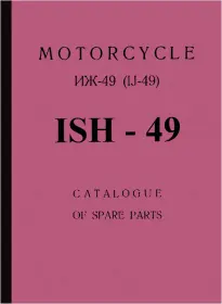 Spare parts list for ISH (IZH) IJ 49 (350 ccm, 2-stroke with rear suspension). Slightly modified Russian replica of the DKW NZ 350, identical in construction to DKW NZ 350 WH. English edition.