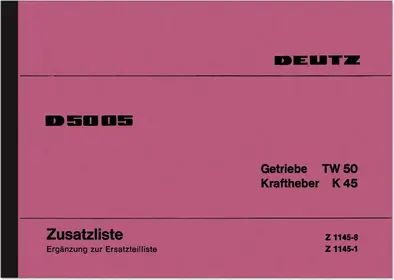 Additional spare parts list for the transmission TW 50 and the power lift K 45, Deutz D 5005. edition in german.