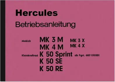 Operating instructions for Hercules K 50 Sprint from Fgst. No. 685150001 (Motor 50 S), K 50 SE and K 50 RE (Motor 50 S/A), MK 3 M and MK 3 X (Motor 501/3 BKF), MK 4 M and MK 4 X (Motor 501/4 BKF). Circuit diagrams included. Edition in German.