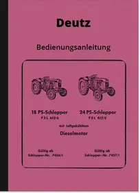 Operating instructions for Deutz diesel tractors 18/24 hp, type F2 L 612/6 valid from engine no. 7456/1 and F2 L 612/5 valid from 7457/1 with air-cooled diesel engine. Issued around 1956, including electrical wiring diagram and lubrication diagram. Deutz list H 1155-3, Dr. No. 60 6 56 O.68755.