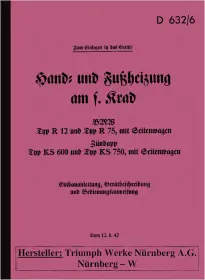 Hand and foot heating on the motorcycle The regulation deals with the installation of hand and foot heaters on BMW R 12 & R 75 as well as ZündAPP KS 600 & KS 750 with sidecar. WH-No.: D 632/6, issue 12.08.1942. Contents: List of individual parts, building instructions, description of the device, operating instructions, maintenance and repair.
