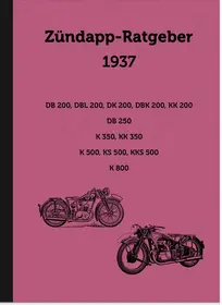 Zündapp advisor for the motorcycles DB 200, DBL 200, DK 200, DBK 200, KK 200, DB 250, K 350, KK 350, K 500, KS 500, KKS 500 and K 800, including technical data and information, general notes, etc. Edition 1937, in German.